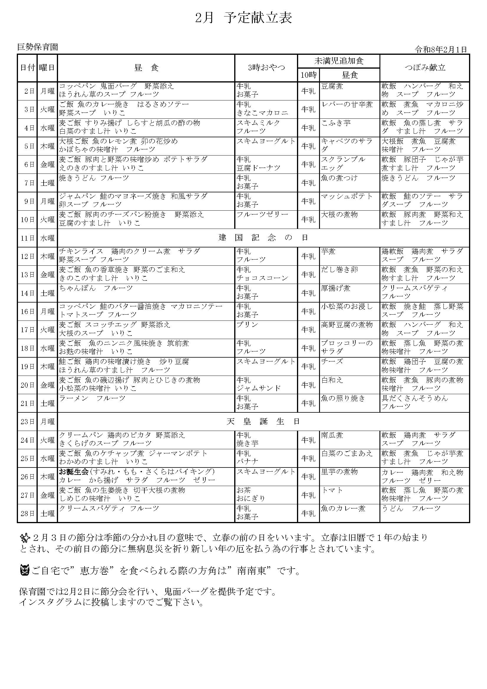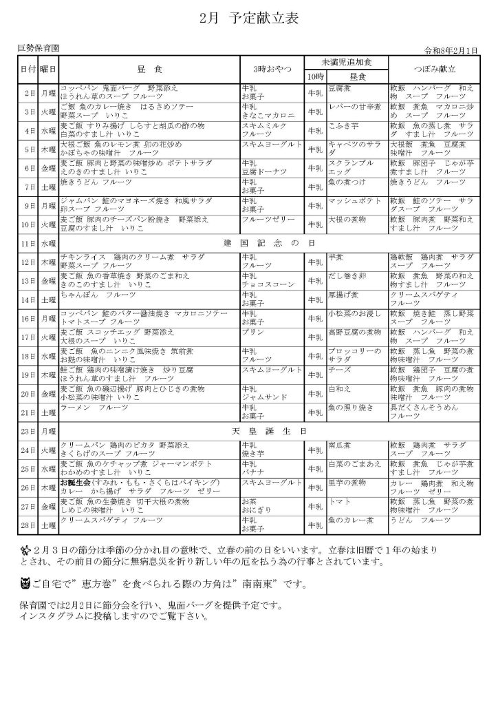 献立表・たんぽぽだよりを